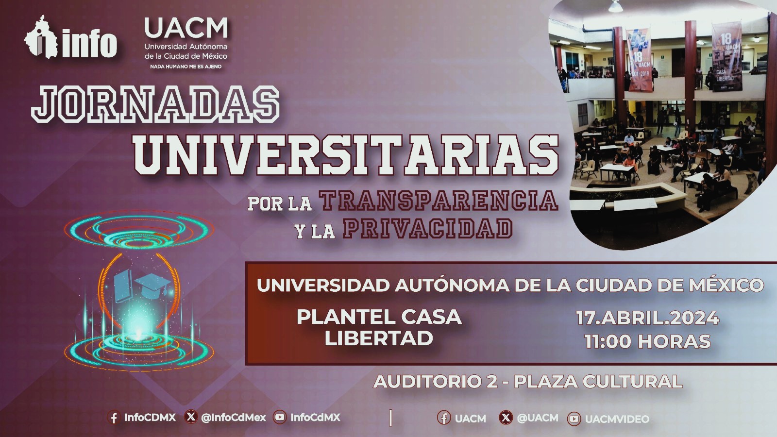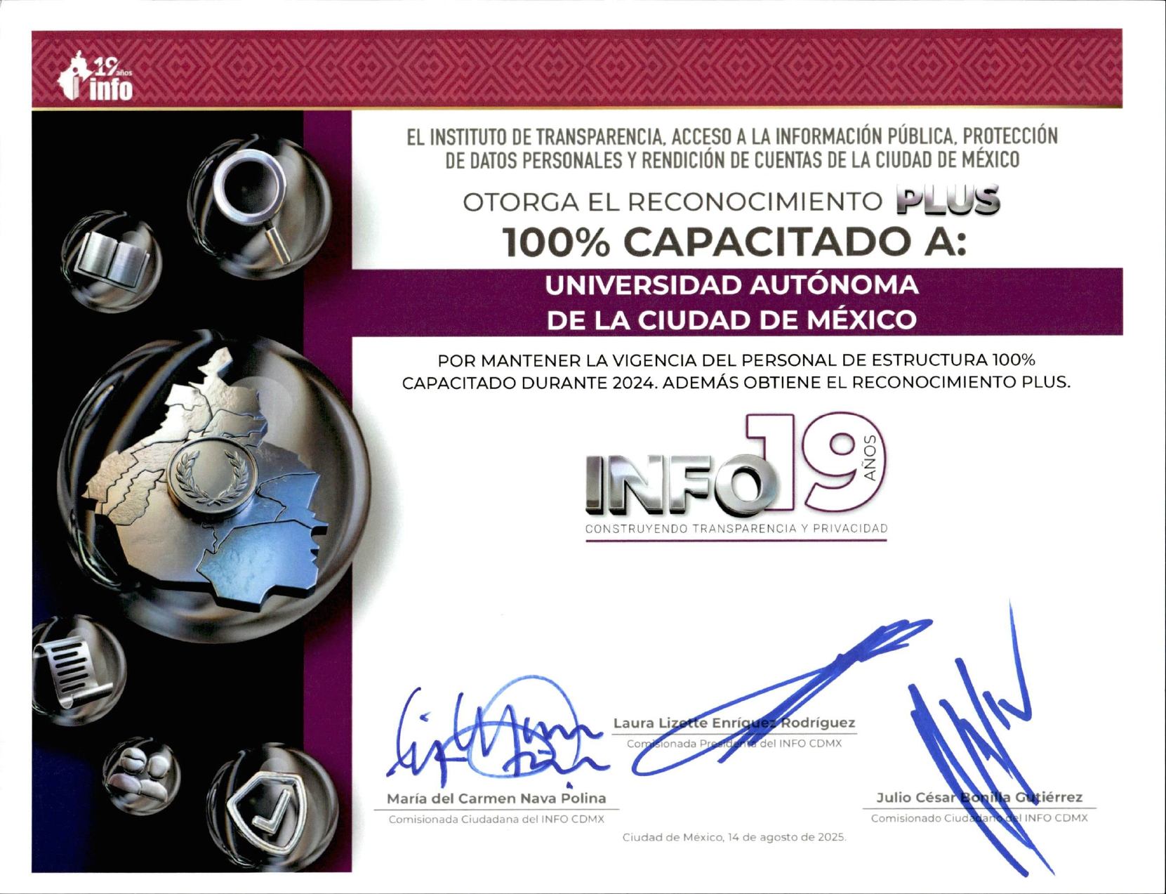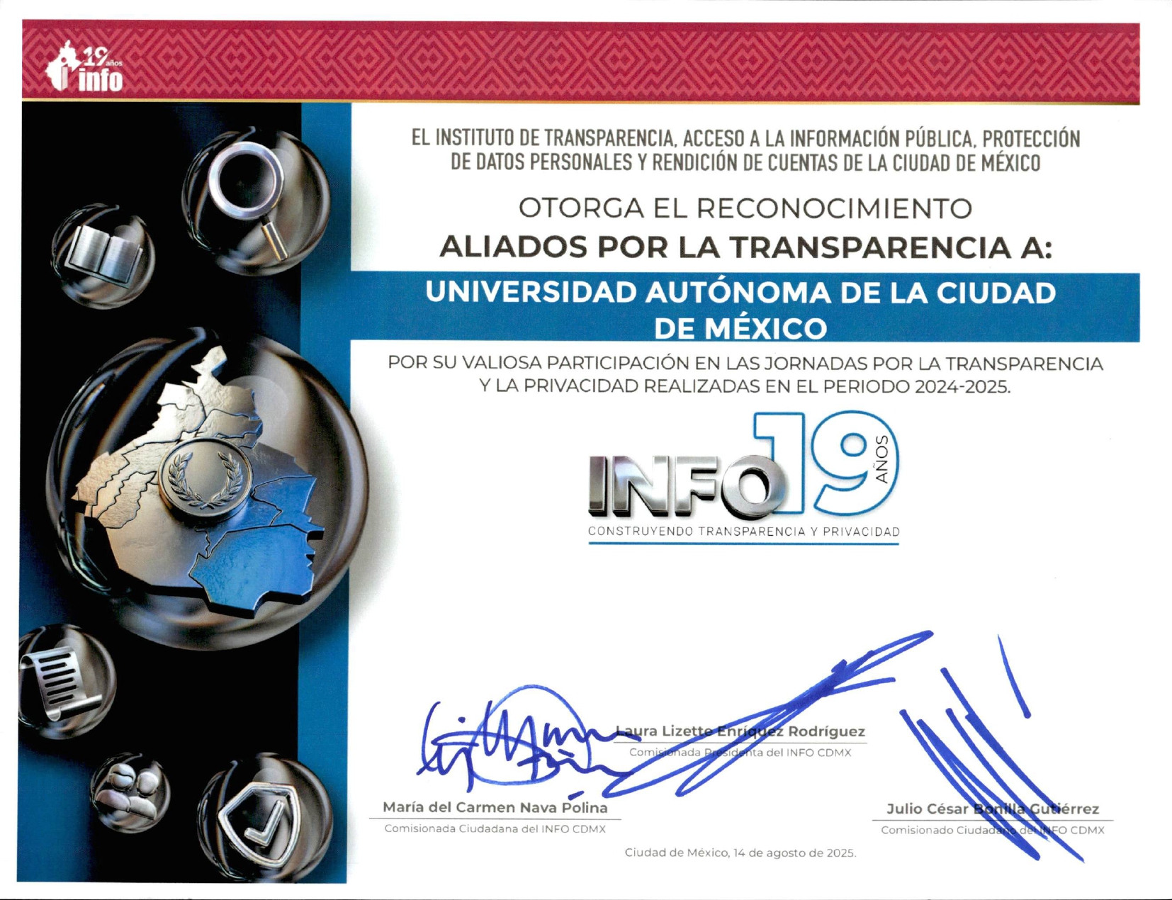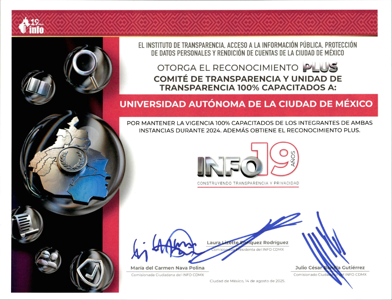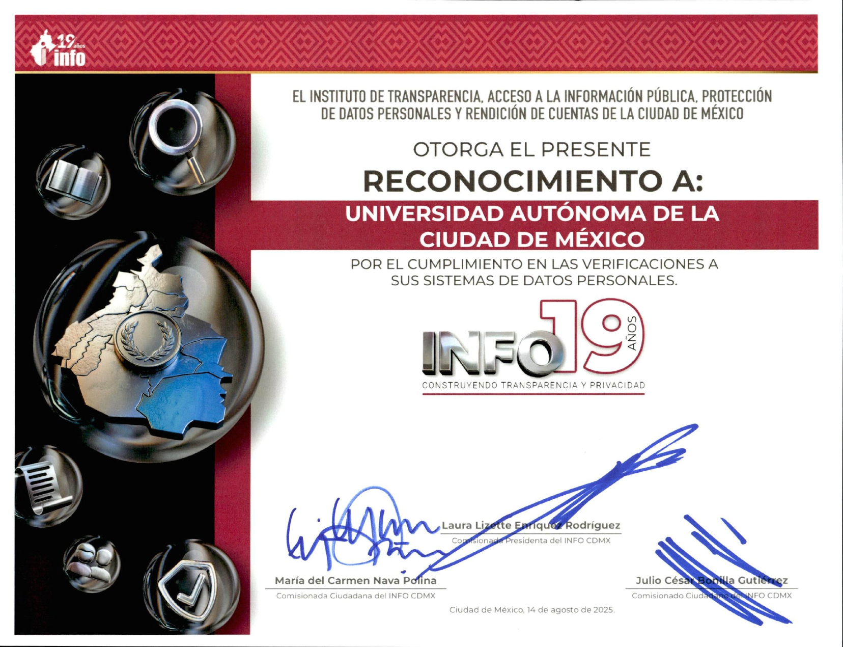 El 15 de agosto de 2025, la Unidad de Transparencia de la UACM fue reconocida durante la ceremonia “INFO 19 años: Construyendo transparencia y privacidad”, organizada por el INFO CDMX. La universidad recibió cinco galardones, destacando su compromiso con la transparencia, la capacitación de su personal y la protección de datos personales.